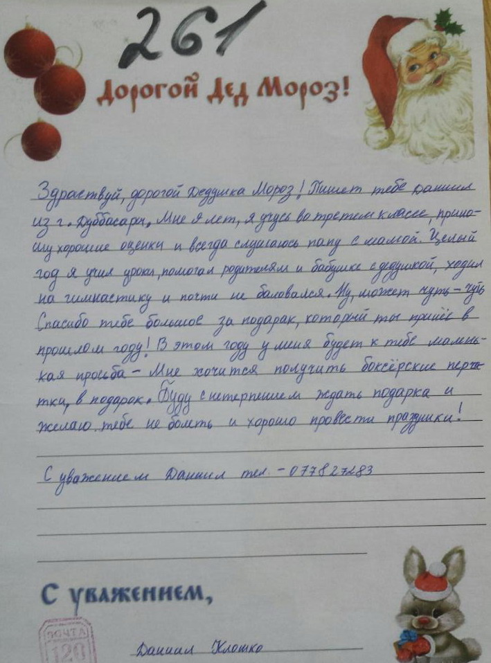 261 Даниил Клошко, 9 лет, хорошо учился, слушался родителей, просит боксерские перчатки у Деда Мороза.