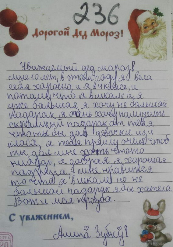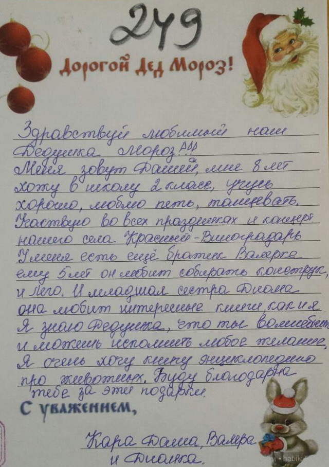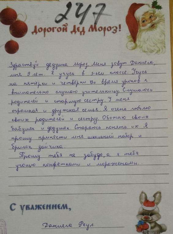 Письмо Деду Морозу 250. Ольга, 8 лет. Помощница мамы и папы. Хочет "набор посудок".