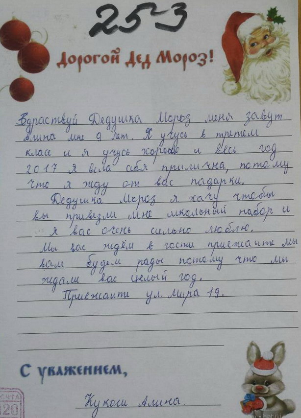 253. Алина 10 лет, вела себя прилично, просит школьный набор и ждет в гости.