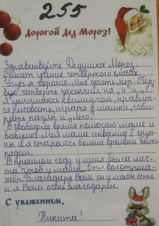 255. Никита 10 лет. Занимается квиллингом, шашками. Любит пазлы и лего. Мама инвалид группы 1. Благодарит Дедушку Мороза за велотренажер маме. Себе ничего не просит.