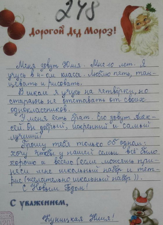 Письмо деду Морозу 248. Юлия 10 лет. Любит петь, танцевать и рисовать. Просит школьный набор и тетрис.