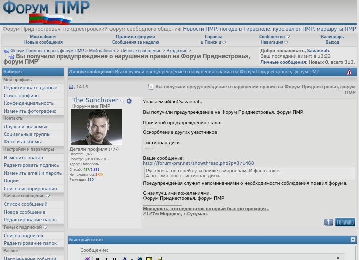 Админ, скажи пожалуйста, содержится ли оскорбление участников форума вот в этом моем сообщении: http://forum-pmr.net/showpost.php?p=371468&postcount=13
