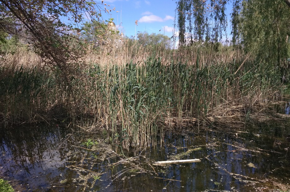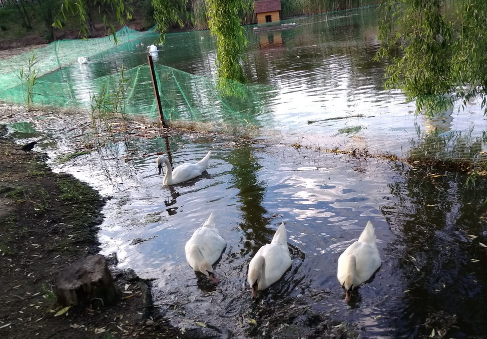 Озеро начали чистить, кстати, вот как выглядят лебеди на этом озере. Что то жуют у берега.