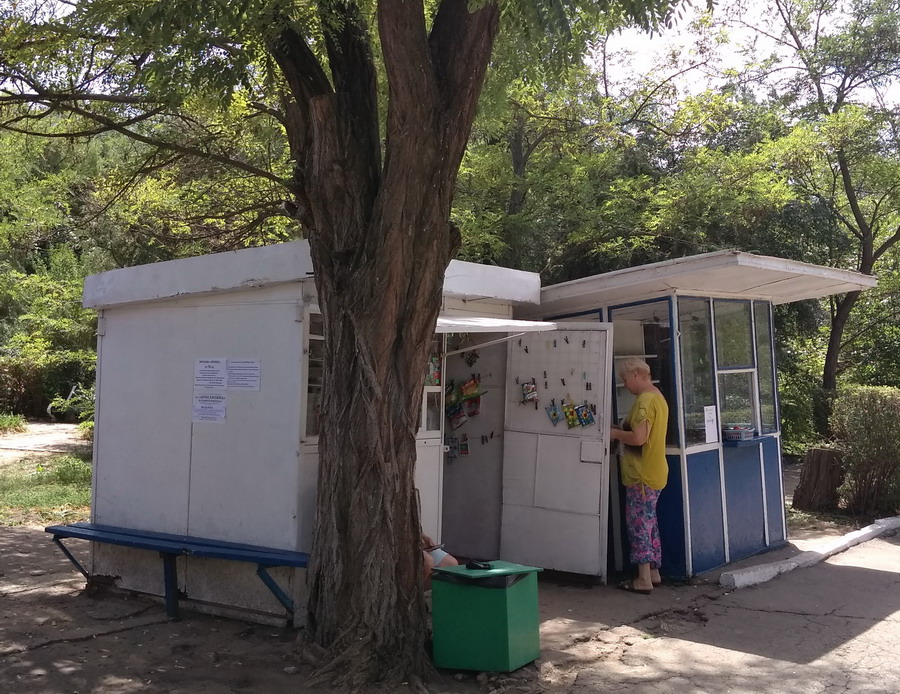 Почти пустой магазинчик на территории базы. Есть чипсы, вода, какая-то фанта, 2-3 вида мороженного и всё.
