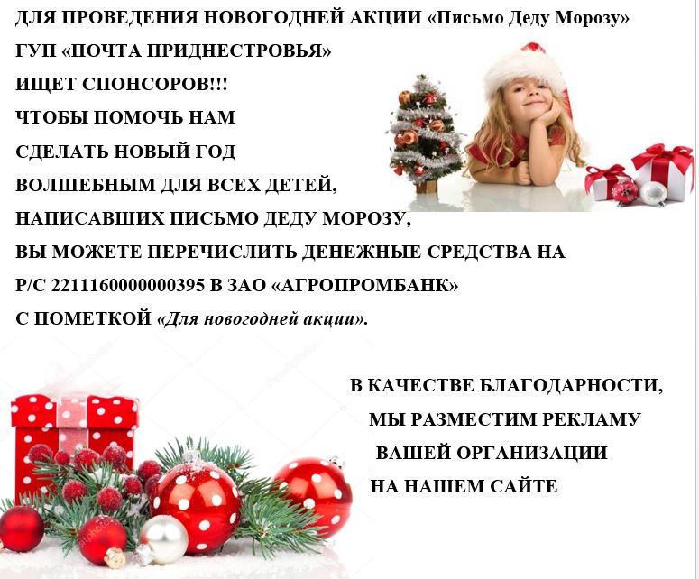 В этой теме я буду публиковать детские письма (помогаю информационно почте), как и в прошлом году. Вложение 27233 Адреса филиалов по районам, для указания в письмах Деду морозу: г. Бендеры, ул. Дзержинского 26 Слободзея, ул.фрунзе 20а Григориополь, ул.ленина 12 Дубоссары, ул.ломоносова 35 а Рыбница, ул.куйбывева 8 Каменка, ул.пролетарская 6 г. Тирасполь, Ленина 17. Спонсорская помощь: Вложение 27234 |