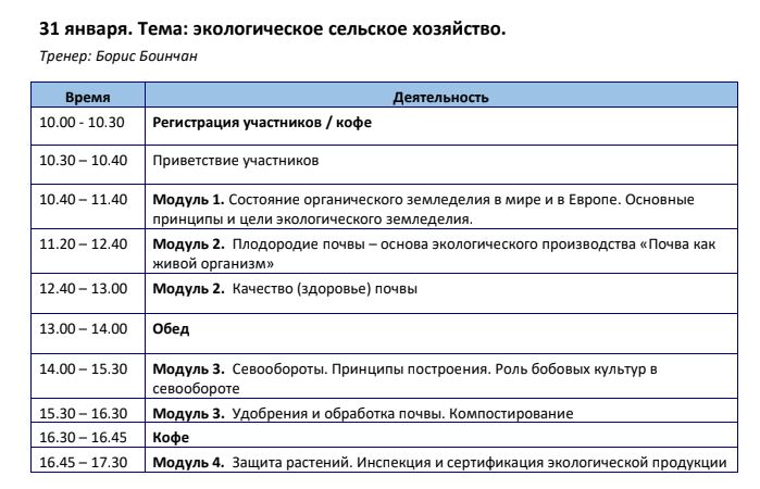 Донор: Посольство Великобритании в Молдове. 31 января. Тема: экологическое сельское хозяйство. Тренер: Борис Боинчан Время Деятельность 10.00 - 10.30 Регистрация участников / кофе 10.30 – 10.40 Приветствие участников 10.40 – 11.40 Модуль 1. Состояние органического земледелия в мире и в Европе. Основные принципы и цели экологического земледелия. 11.20 – 12.40 Модуль 2. Плодородие почвы – основа экологического производства «Почва как живой организм» 12.40 – 13.00 Модуль 2. Качество (здоровье) почвы 13.00 – 14.00 Обед 14.00 – 15.30 Модуль 3. Севообороты. Принципы построения. Роль бобовых культур в севообороте 15.30 – 16.30 Модуль 3. Удобрения и обработка почвы. Компостирование 16.30 – 16.45 Кофе 16.45 – 17.30 Модуль 4. Защита растений. Инспекция и сертификация экологической продукции Вложение 27342 |