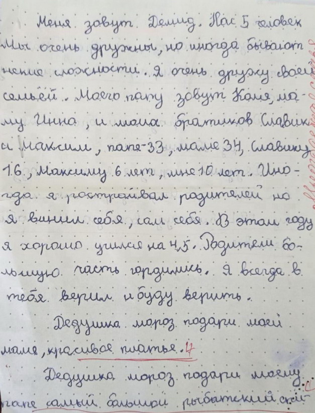1. Давид, 9 лет. Карагаш. Любой подарок. 2. Демид 10 лет, два брата 16 и 6 лет. Есть мама и папа 30+ лет. Просит майнкрафт и футбольный мяч братьям, а себе колонку Блютуз военную. Вложение 27865