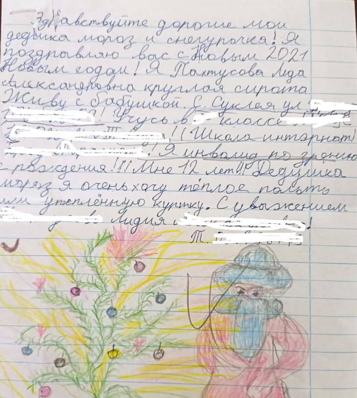 3. Суклея, Лида - круглая сирота, учиться в 6 классе в школе интернате - 12 лет, просит теплое пальто или утепленную куртку у Деда Мороза.