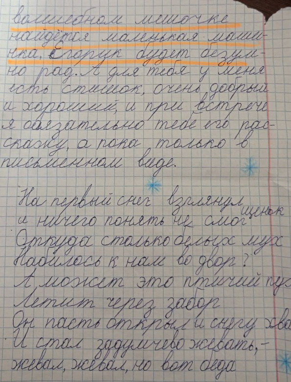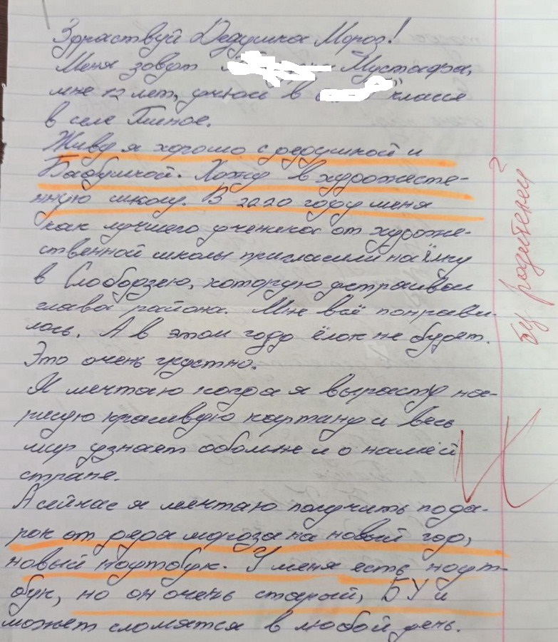 Село Глиное, Мустафа - 12 лет, живет с дедушкой и бабушкой (родители не помогают ничем).Был на елке в Слободзее, которую устроил глава района, как лучший ученик художественной школы. Мустафе понравилось. Мечтает о новом ноутбуке, есть очень старый ноутбук, по которому учиться в школе онлайн, боится что ноутбук сломается. Можно и лего. Вложение 27874