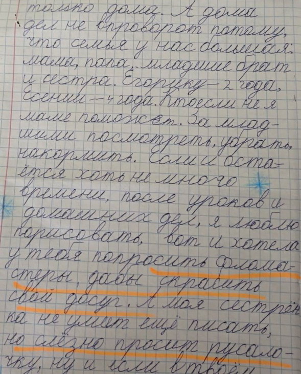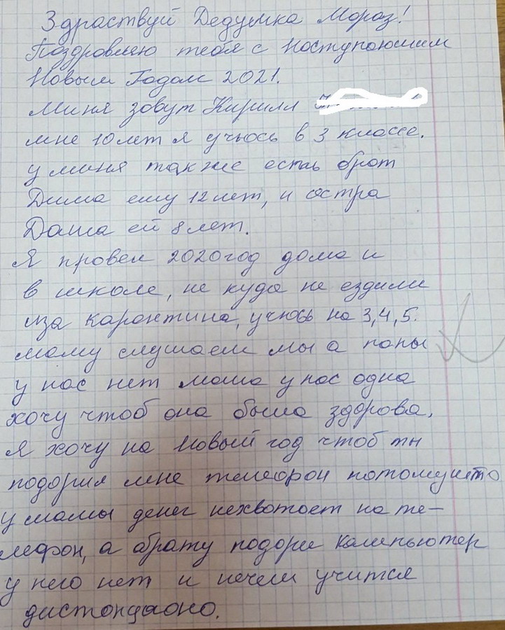 Просит телефон и компьютер брату - дял дистанционного обучения. Сестре - школьные принодлежности. Данные детей: 10 лет, Кирил - 140 см, обувь - 35 размер, 12 лет, Дима - 150 см, обувь - 35 размер, 8 лет, Даша - 130 см, обувь - 33 размер. Нужны куртки, штаны. Вложение 27878