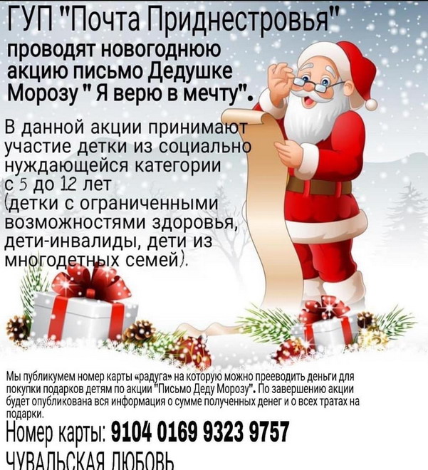 Кто хочет помочь - дети будут рады. Вложение 27864 Номер карты для сбора денег для подарков детям 9104016993239757 Чувальская Любовь. В Тирасполе подарки можно принести на центральную почту, сфоткать и отдать работнику почты Юлии - 77835295. Вложение 27909 Если кто-то хочет почувствовать себя в роли "Деда Мороза" и подарить подарок ребенку из крайне неблагополучной семьи (родители-инвалиды, дети-инвалиды, неполные семьи где родитель живет на зарплату 1000р, отсутствие родителей и опекунство бабушек-дедушек), то это можно сделать! Для участия достаточно прочитать что-то из писем, выбрать одного ребенка, отписаться в комментарии о выборе, купить/найти подарок и отнести на центральную почту. Дети просят абсолютно разные вещи начиная от б/у компьютеров, смартфонов, планшетов, продолжая игрушками, школьными принадлежностями и заканчивая продуктами и дровами. |