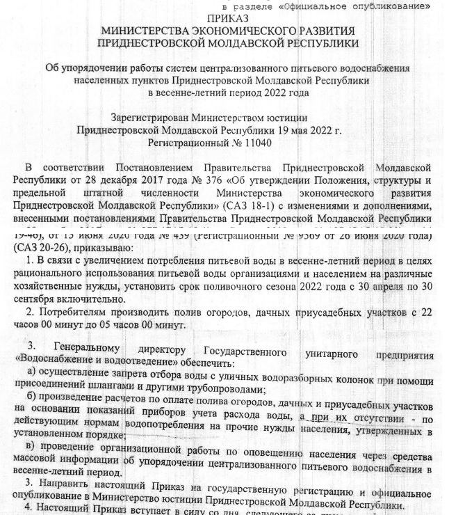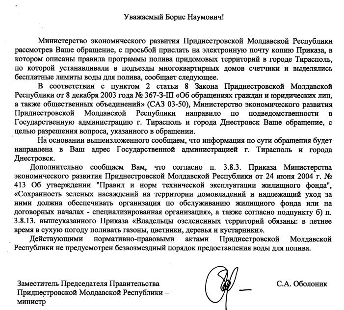 Написал я письмо (обращение гражданина) в адрес Министерства экономического развития ПМР с просьбой прислать мне на электронную почту копию Приказа, в котором описаны правила программы полива придомовых территорий в городе Тирасполь, по которой устанавливали в подъезды многоквартирных домов счетчики и выделялись бесплатные лимиты воды для полива.
