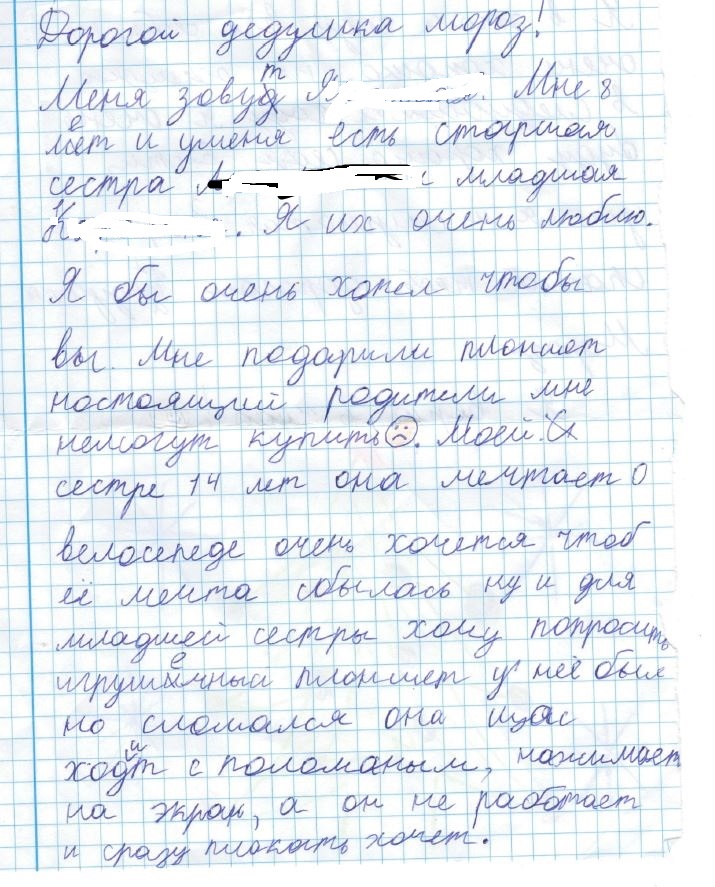 Есть две сестры, А....а - 14 лет, мечтает о велосипеде. К...а 1,5 года - просит игрушечный планшет. На данный момент очень сложное материальное положение. Вложение 28840