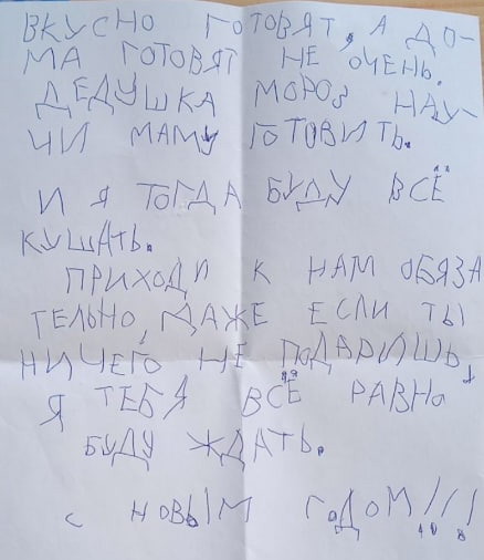 Акцию проводит Почта Приднестровья. "Сложные" письма присылают мне и я ищу спонсоров. Письма не проходят проверку на материальное обеспечение семей. Определить по тексту - как живут люди не всегда можно. Как правило есть только текст письма и домашний адрес. Как помочь? Купить и сфотографировать подарок и отнести его на почту, написав мне и сказав на почте - кому именно подарок. Можно и перевести деньги на покупку подарка, думаю на мою личную карту. Мой тел 77814411. Эфрос Борис Наумович. счет в АПБ № 2226160001210229 (отдельный рублевый счет) Номер карточки радуга - 9104 0184 7301 0989 Вложение 28842 Вложение 28848 По письмам - часто дети пишут что нужен телефон в многодетную семью, для учебы. Если дома есть вайфай - то можно и телефон СДМА, который после Нового года наверняка будет не нужен - так как мобильная связь на нем перестанет работать. Получено: 20 дек: 200 Анна_Б, 200, 100 Ирина_С, 100 Даниил_К, 100Наталья_М, 50 = 750р 21 дек: 300р Елена_Л. 22 дек - 1000р. Сергей_К, 50 Наталья_Ш, 100 Игорь_Н. = 1150 23дек - 50 Марина_С, 100 Елена_Р, 50 Ирина_Х, 500 Алексей_Ш. 24дек - 300 Атрем_С, 100 Екатерина_Р, 170 Владимир_В,30+ 150+100 =850 1000 Вадим_Г. 25дек - 100 Евгений_Ц, 100 Светлана_К., 200 Дарение, 100 Дарение. 26дек. 900р - Вадик, 400 - Натаья_П. 27дек - 200 Светлана_К 3 820 - Иван с России. 1400 - МинЦифры 50 Анастасия_М 30 дек - 100 - Сергей_Б 500 - Татьяна_З 100 - Александр_С 1600 - Юрий_Б 31 дек - 100 Дарья_Н 200 - Наталья_Ф 400 - Валерий_Ю 50 - Максим_К 200 - Кирил_Б 250 - Дмитрий_Т Получено +11700 Потрачено. -10050 (Остаток на следующую акцию - 1650р.) 580 конфеты 2, ,18 письмо 360 конфеты - 7 письмо 90 конфеты - 30 письмо 430 - машинка на пульте, кукла лол, маленькие кукулы. 270 - кроватка 145 - рюкзак 125 волейбольный мяч 285 - набор художника 90+45 игрушки 40 два человечка. 290 - 2 машинки на пульте 180 - мячик 270 - селфи палка. 290 - наушники. 1500 - Сладости 900 - докупили сладости в Слободзее. 125 - топливо 30 дек 367 - кукла, лего, пистолет. 55 - 2 сумки мальчикам. 222 - 2 сладких подарка и большой шоколад 165 - лего + машинка малышу 400 - сладкие подарки 142 - школьные принадлежности 347 - памперсы 1000 - роутер и подключение интернета. Письмо 31 -мать в дет саду, 4 детей, папа умер. 976 - 244*4 сладкие подарки "Славянка" по 3 кг 372 - 2 сладких подарка - в Рыбницу и с. Далкеу. 6 компьютеров от Игорь_Г, Дмитрий_Ж, Максим_А, Виктор_Я. Детские игрушки от Кожухаренко Елены. |