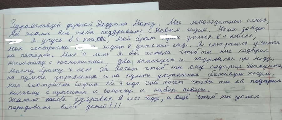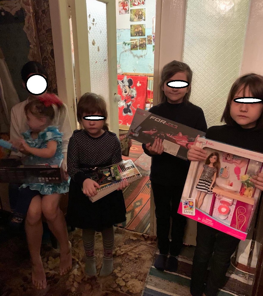 Мальчик 6 класс. Майнкрафт. Учиться на 4 и 5. Мальчик 4 класс. Автомат АК-47 на орбизах. Хочет стать миллиционером. ИЛи поезд с ЖД дорогой. Девочка 5 класс. Часы-смарт. ИЛи кукольный набор. Девочка 1 год. Живут очень бедно. Вложение 28855 Навели справки - там очень бедные и дом разваливаться и дети полухолодные/голодные. Не очень понятно где мама. Вложение 28917