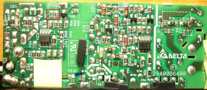 Это чисто моя идея, что нужно заменить в этом БП, чтобы регулировать напряжение от 15 до 25 Вольт. Хотя я не специалист в электронике, и это просто хобби, на которое я больше трачусь. Надо заменить R61 и R62 (они параллельно подключены, обведены красным на фото). Заменяете их переменным резистором на 10 кОм, только выкрутите его на максимум. Это даст 5 Вольт (нестабилизированных), медленно крутите переменный резистор против часовой стрелки, и напряжение будет возрастать. Примерно на 15 Вольтах напряжение идеально стабилизируется и можно его повышать. Больше 24 В нельзя, потому что там электролиты на 25 Вольт. В идеале их заменить - хотя бы на 35-вольтовые (той же емкости примерно или чуть больше). В общем, можно получить любое напряжение в диапазоне 15-25 Вольт (выше не проверял). На фото обвел красным эти 2 резистора, которые надо поменять на один 10-килоомный. Если знаний 0 по импульсным блокам питания, то лучше не лезьте, там опасное напряжение в высоковольтной части. Работы проводите только под руководством опытного мастера. Вложение 28981 |