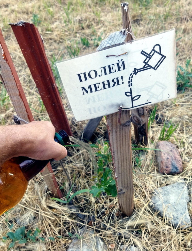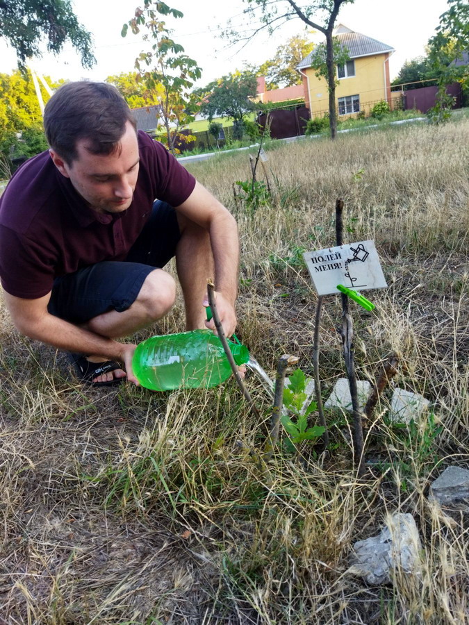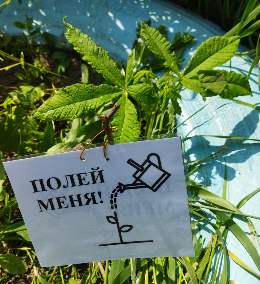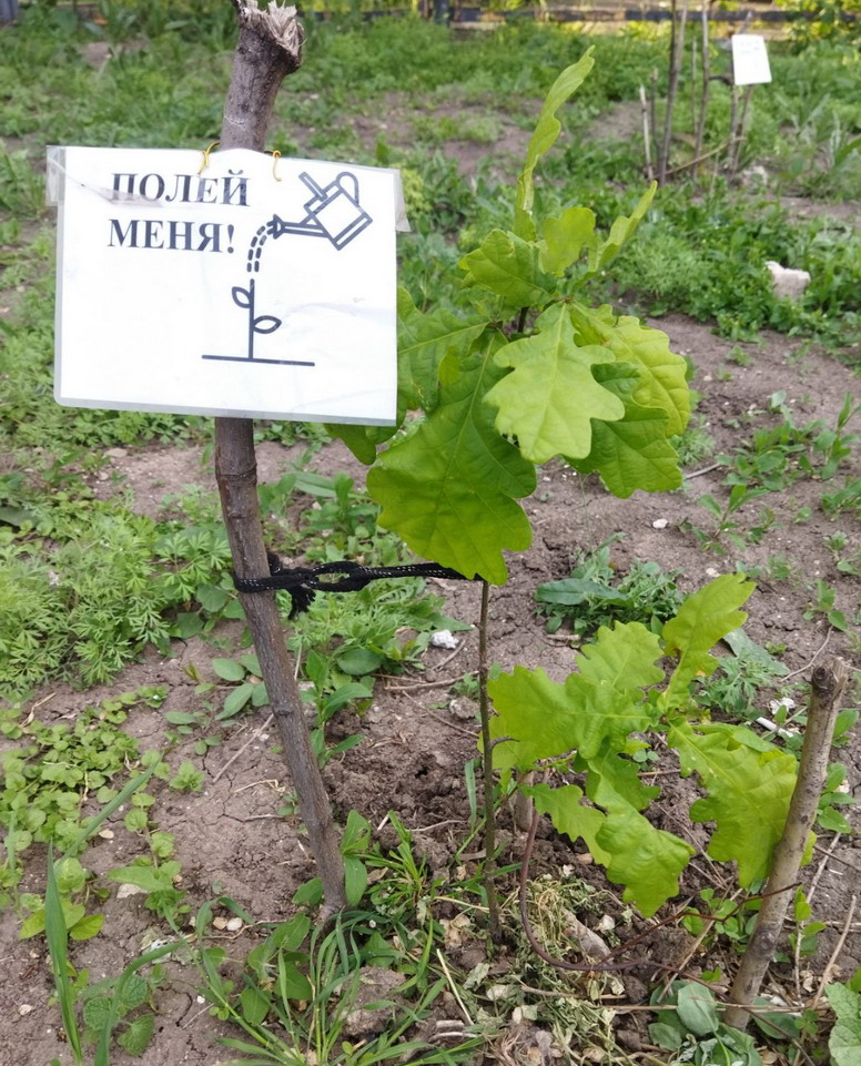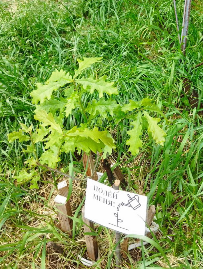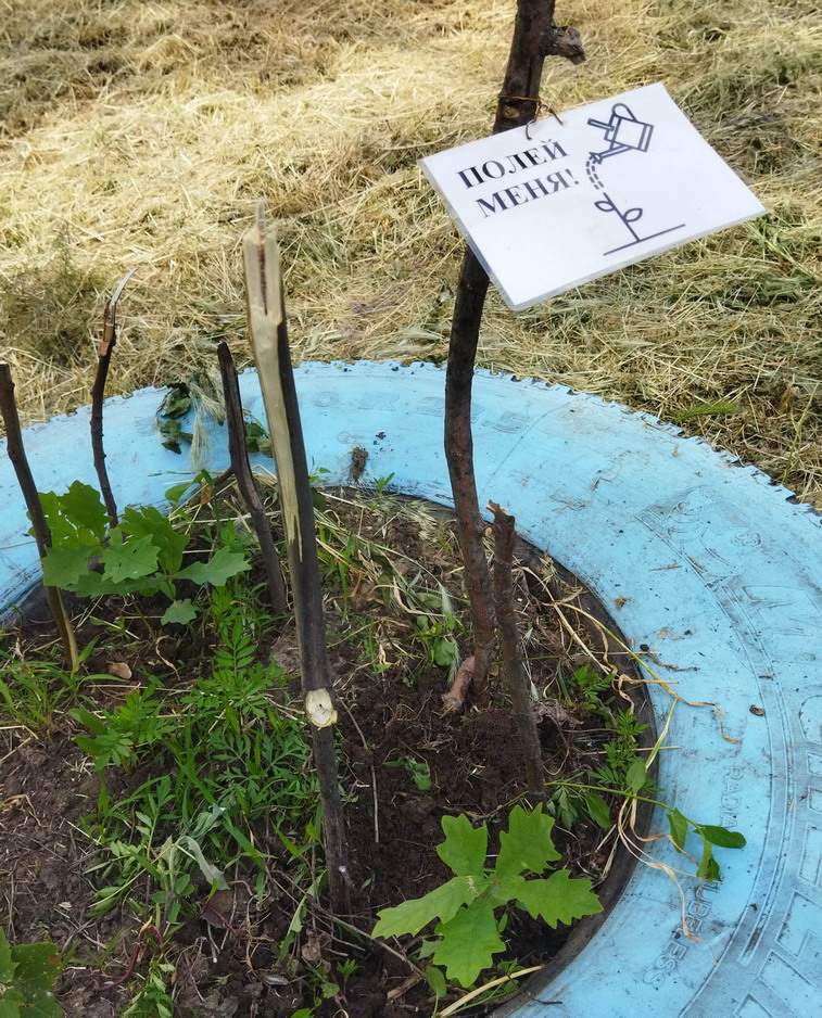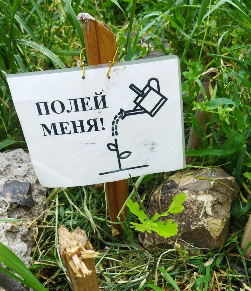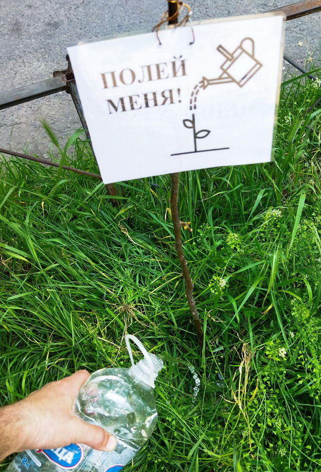 Снова начали акцию "Полей меня" - повесили на саженцы заламинированные таблички с текстом "Полей меня", а так же и поливаем саженцы.