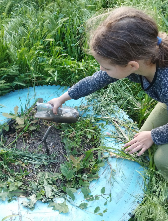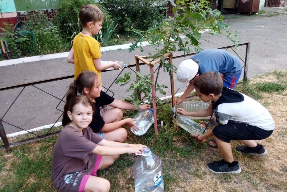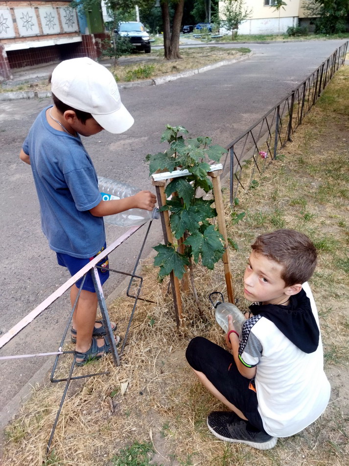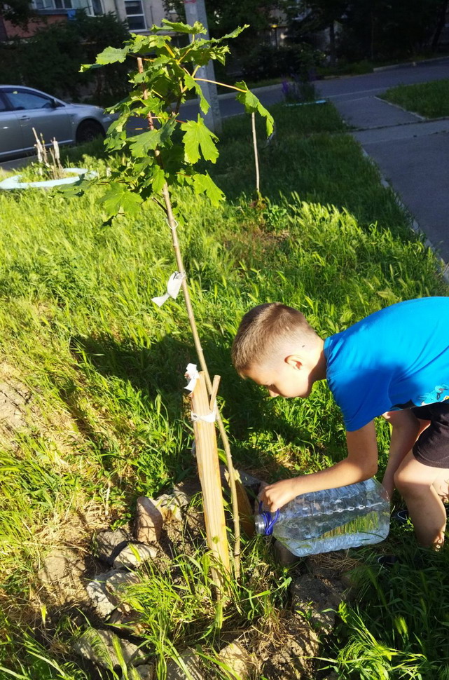 На красных казармах дети уже стали мне помогать с поливом саженцев дуба и клена.