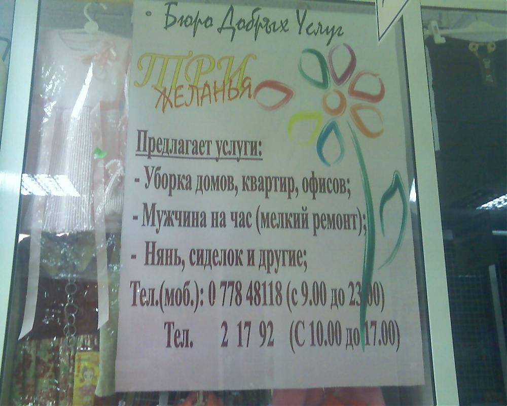 Ребята выполняют три желания. Особенно мне понравился вариант - мужчина на час. Только в Бендерах есть такой сервис или бюро реально добрых услуг. Для девушек скидки? |