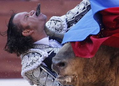 Несчастный случай на корриде в Испании. Бедный матадор, бык пробил ему горло.