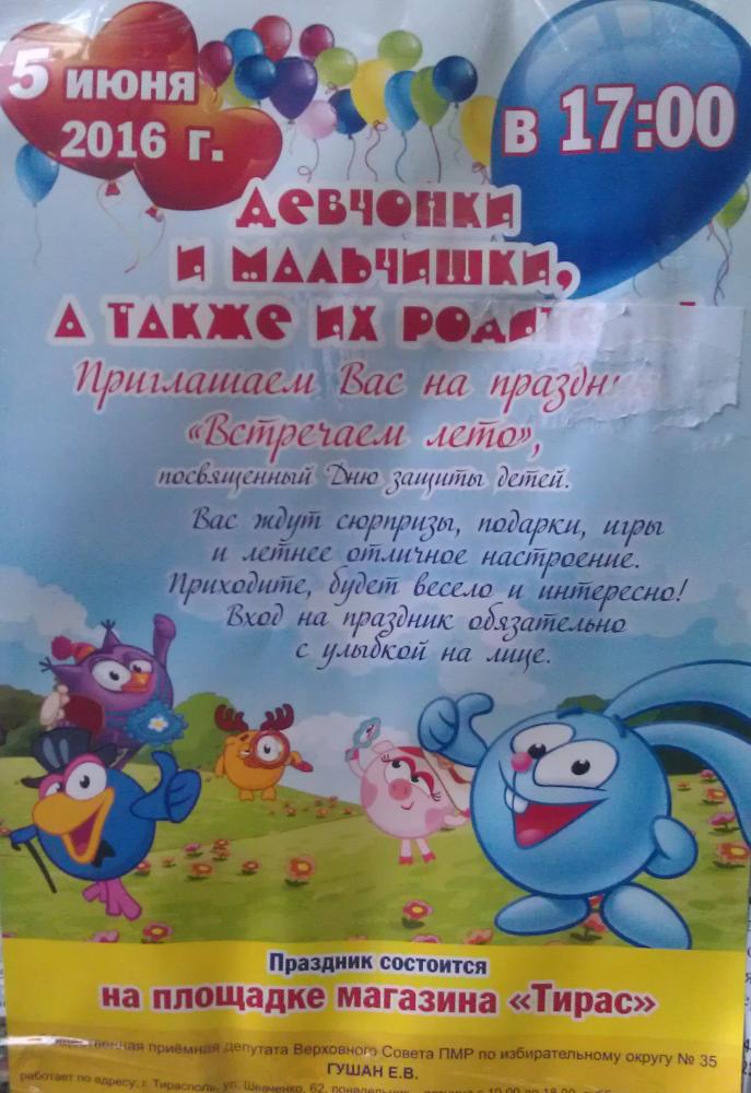 У нас в районе Красные казармы завтра депутат ВС ПМР - Гушан устраивает детский праздник в честь дня защиты детей.
