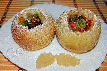 Готовые яблоки украсить кусочкам разноцветного мармелада и слегка посыпать сахарной пудрой.