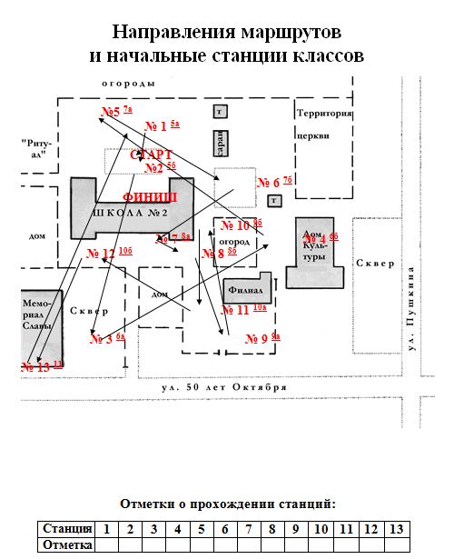 Предупреждаю заранее - интересно будет, разве что, педагогам или родителям школьников среднего звена и старших классов. Нынче у школы День Рождения - сколько-то там лет (в зависимости от продолжительности копания в архивах от 68 до 150). Уже лет 10, как всешкольно отмечаем. Решили от балды праздновать в последнюю субботу октября, но сейчас перенесли на последний день четверти, потому совпало с Хеллоуином. Кое что успел заснять на телефон. С утра было что-то вроде линейки. Перед ней все ходили с мрачными лицами и никак не могли определиться: стоит ли вообще проводить - сыро и лужи кругом. Потом распогодилось и решили таки рискнуть. Кусок школьного двора до начала всего безобразия: На линейке принимали поздравления, дружно орали "С Днем Рождения, школа!!!" и прочая. Меня там не было - я был уже на станции (см. ниже), поэтому толкового снимка линейки не вышло. Ну, что-то такое, в общем, (вид из-за спин): Опосля линейки затеялась спартакиада 5-х - 11-х класов. Суть, в общем, следующая: на прилегающей к школе территории располагаются станции. В нашем случае, охват территории примерно 400x300 метров. На каждой станции учащиеся всем классом должны выполнить определенное задание. Задания несложные, самое главное, чтобы весь класс действовал согласованно и дружно - в этом и заключается смысл спартакиады: дать возможность детям ощутить сплоченность коллектива, собственную в нем роль, "чувство локтя" товарища. Участвуют все, включая классного руководителя, который тоже бегает, пыхтит и мысленно матерится. Навскидку, станции, которые могу припомнить: 1. Пробежать по доске всем классом, взявшись за руки, не размыкая цепочки и не ступая на землю. 2. Переправиться всем классом через "горную речку" (две линии на асфальте) - два самых суровых парня на руках переносят через нее всех по очереди. 3. Пролезть, опять же, цепочкой, взявшись за руки, через подвешенный обруч. 4. Влезть всем классом на дерево и громко спеть веселую песню. 5. Встать всем классом так, чтобы на земле оставалось как можно меньше ног (кто-то на кого-то влез, кто-то за кого-то уцепился). 6. Изобразить классом олимпийские кольца. 7. Охватить в сквере кольцом как можно большее количество деревьев (можно снимать с себя куртки, всякое шмотье, браться за рукава, штанины - лишь бы кольцо было побольше). 8. Нарисовать на асфальте эмблему класса. 9. Собрать на время здоровущий паззл из небольшого количества фрагментов огромного размера. ... и т.д. Вспомню еще - допишу. Главное, чтобы задания были примерно равны по продолжительности выполнения. Для того, чтобы не было путаницы, каждый класс получил свою маршрутную карту с указанием их движения: Весь фокус в том, что, чтобы не было на одной и той же станции столпотворения, каждый класс начинает со своей станции. 5а - с 1-й, 5б - со 2-й, 6а - с 3-й и т.д. Число станций равно количеству классов. (Все маршрутные карты различаются немного из-за этого). Присутствующий на станции судья ("смотритель") оценивает качество выполнения, скорость, учитывает количество детей в классе и ставит свою оценку прямо в ней. Потом вся компания дружно бежит на следующую. В итоге, дети за полчаса набегают в общей сложности километра 4-5, захекаются, но у всех будет хорошее настроение. Некоторые фото, которые успел классный руководитель 6-го "б" класса снять на одолженный у меня мобильник: Моя станция. Бандиты бегут по "бревн