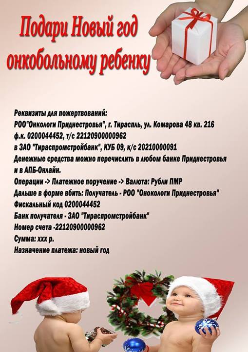 Мария: Дорогие и неравнодушные, общими силами уже начали распространять информацию об акции среди населения и приднестровских предприятий. Многие готовы оказать посильное содействие. Никто не отказывается. Кто деньгами, кто подарками, кто транспортом. Поэтому наши ряды увеличиваются. Активисты РОД «Содружество молодых» к участию в акции «ПОДАРИ НОВЫЙ ГОД ОНКОБОЛЬНОМУ РЕБЁНКУ» уже привлекли ряд приднестровских предпринимателей: ООО "Либерти-центр" ООО "Либерти-центр", магазин модной одежды "Элит", АН "Макс-плюс", ООО "Жил-сервис" (Компания "Жил-Сервис" в Приднестровье), ООО "Лавсар", кафе "Аджика", НП "Клуб деловых женщин" Клуб Деловых Женщин. Можете рассчитывать на поддержку РОД "Содружество молодых" в полном объеме. У нас есть люди, помещение, дизайнеры, молодые журналисты и даже 2 костюма Деда Мороза и Снегурочки. Будем также по максимуму распространять информацию. Планируем собрать за круглым столом и другие молодежные организации, пригласить их к участию. Вот уже присоединились: Компания ООО "Либерти-центр" официально присоединяется к акции "Подари Новый Год онкобольному ребенку". Приглашаем всех наших клиентов оказать содействие и подарить частичку своего тепла детям. В наше время протянуть руку помощи больным детям может каждый желающий. Главное иметь большое желание, а возможности здесь - не самое главное. Ведь, не обязательно пересылать только крупные сумы денег, когда можно подарить куклу, фрукты или игрушку, каждый обладает такими возможностями. Ребенку всегда приятно, ведь многие из них больны и не могут принимать участие в массовых елках. А когда Дед Мороз в рамках акции, поддержанной приднестровским народом, общественными организациями и предприятиями, придет в каждый дом, сколько же будет радости и счастья! Акция проходит уже не первый год. Результаты прошлого года были видны на детских личиках, когда они радовались подаркам и гостям. Присоединяйтесь!