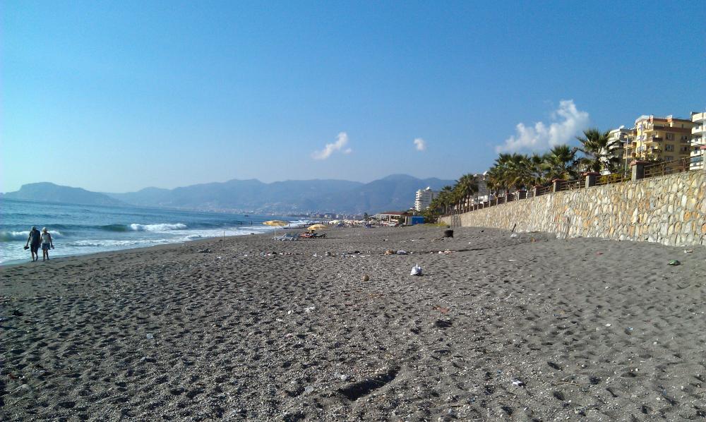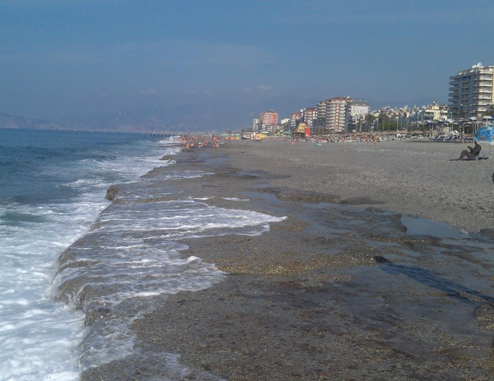 Про пляжи: в Махмутларе - это монолитный берег, сплошная скальная порода, зачастую мрамор. У отелей прорубают нормальный вход в воду. Угадайте - на фото камни? Нет, это цельная порода, отшлифованная водой. А в Аланье - песчаные пляжи, гораздо лучше для купания, при сильных волнах безопасно. А то можно просто разбить голову об камни - волны сносят и сбивают с ног. |