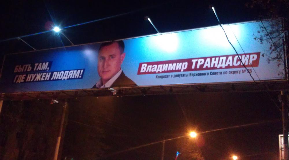 Заметил огромный плакат кандидата в депутаты ВС - В. Трандасира.