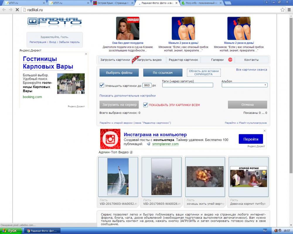 Какая реклама? Не пиши чушь. Ставь прогу, а не через сайт! и по клику на картинку или группу картинок они заливаются и автоматом в буфере ссылки и даже в тэге.