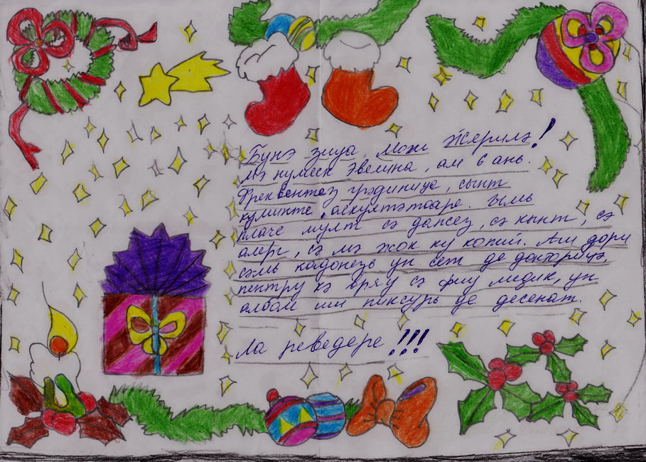 Даниела учится в 5-м классе, учится хорошо, у нее есть братик, ему три года. Даниела помогает родителям, бабушкам и дедушкам. Даниела мечатет чтоб братику подарили трактор, а ей красивый браслет и конфеты. Даниела поздравляет всех с новым годом! Перевод: Добрый день, Дед Мороз! Меня зовут Даниела, мне 11 лет и учусь в 5-м классе. В этом году я была послушной девочкой, учусь хорошо, помогаю родителям, дедушкам и бабушкам. У меня еще есть брат, его зовут Денис, он еще маленький, ему три с половиной годика. Но уже верит в Деда Мороза, он желает много игрушек, но я знаю, что невозможно, я бы хотела, чтобы Вы выполнили одно мое желание, что поздравить брата с Новым Годом машиной или трактором, а мне, если можно, красивый браслет и конфеты. Мы будем ждать тебя и в следующем году. Дед Мороз. С большим уважением и любовью Балан Диниела. До свидания. |