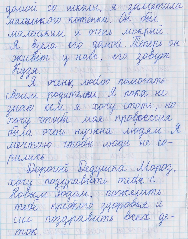 Габриел учится в 4-ом классе на 5 и 4. а Еще ходит в музыкальную школу и играет на пианино, помогает маме по дому и очень любит зиму. В подарок на новый год хотел бы получить блокнот на 300 страниц, в котором было нарисовано черное пианино. До свидания Дедушка мороз! Перевод: Здравствуй Дед Мороз. Меня зовут Ефремов Габриел Васильевич. Учусь в 4-ом классе на 5 и 4. Учусь еще в музыкальной школе на пианино и в юмористическом кружке. В обоих кружках учусь хорошо. Мне 10 лет, родился 10 апреля 2007 г. Я помогаю маме по дому, из всех времен года люблю зиму, потому что зимой могу играть в снежки, катаешься на санках и играешься с друзьями. Больше всего мне нравится зимой, когда иду с хэитурами. Дед Мороз, хочу на Новый год блокнот с 300 страницами и чтоб было нарисовано черное пианино. До свидания Дед Мороз, хорошего дня. (Это стихотворение – хэитурэ. ) «Добрый вечер у калитки, Мальчикам и девочкам. Добрый вечер всем, Тем, что на печи. Мы пришли к вам, что под окном ….Хэй, хэй» |