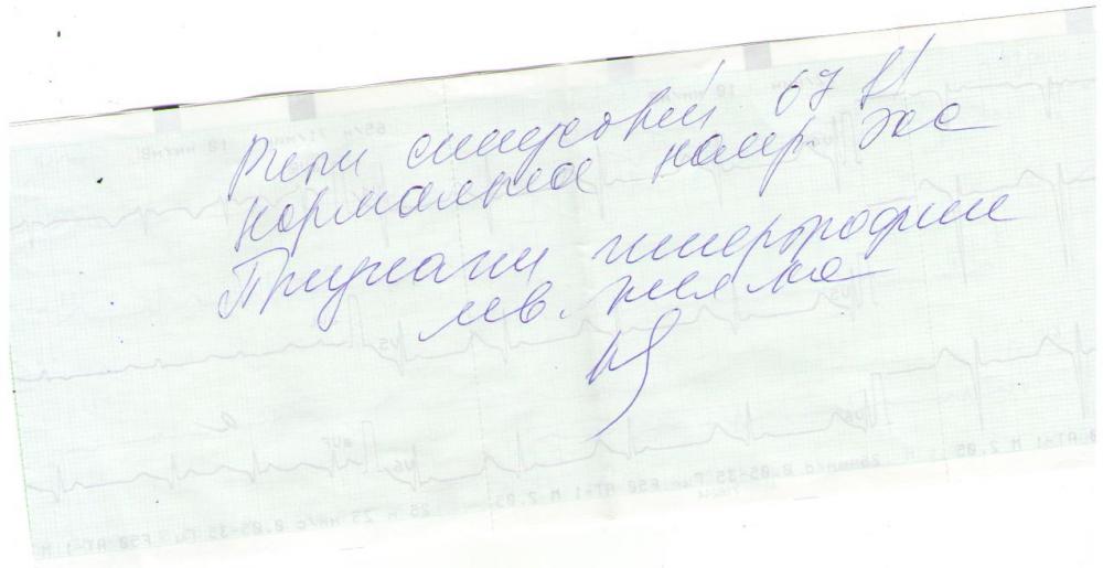 Уважаемые форумчане, особенно те, кто связан с медициной, расшифруйте, пожалуйста, почерк врача. Это результаты ЭКГ.