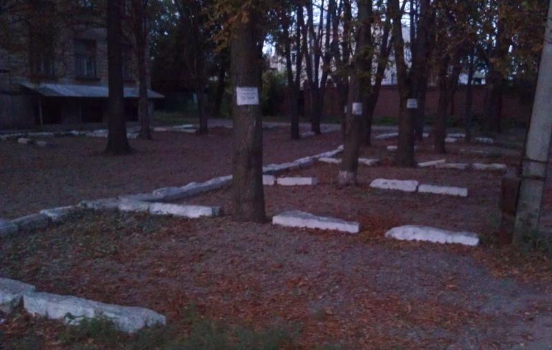 Парковка для машин учителей и всяких преподавателей Совхоза-Техникума имени Фрунзе. На бумажках указаны номера авто.