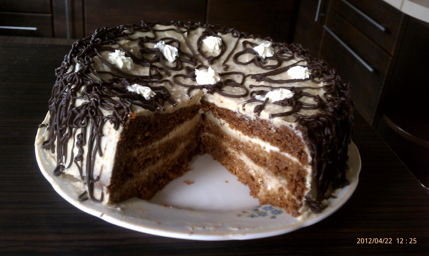 вот еще один: коржи - медовый бисквит, крем-шарлот ореховый!!!пропитка сметанная чуть с сахаром для кислинки. над украшениями торта еще работаю.делала торт на заказ.заказали еще один на 6 мая.