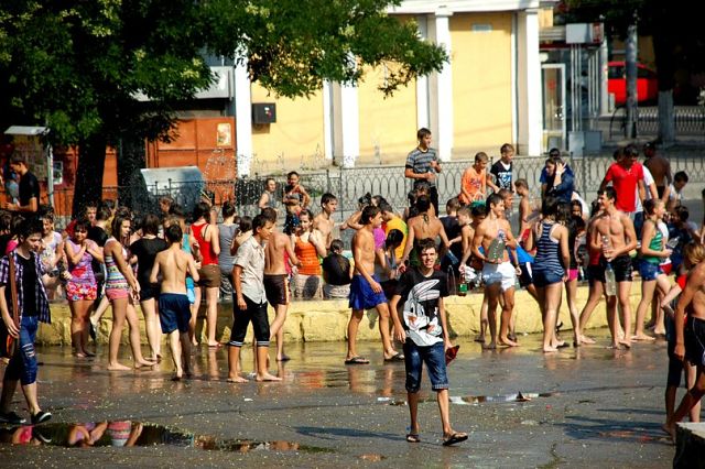 А мне нравится! Жара, народ развлекается, как может. Вряд ли кто-нибудь может обидеться, если его окатят холодной водой при +39 градусах. Разве что, выряженный в строгий костюм с галстуком и белой рубашкой сноб, спешащий на важную деловую встречу.
