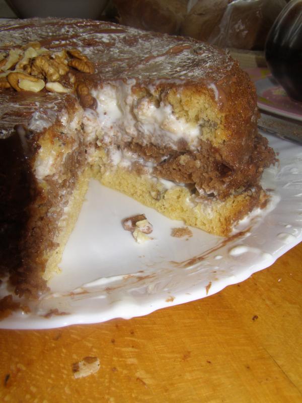 Две ошибки. Шоколад надо было черный( и то половину дети приговорили))) и разрезать когда остынет совсем...