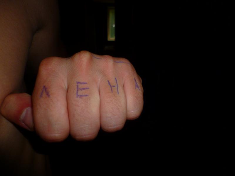 он берет ручку, начинает рисовать на пальцах буквы, а потом показывает мне :