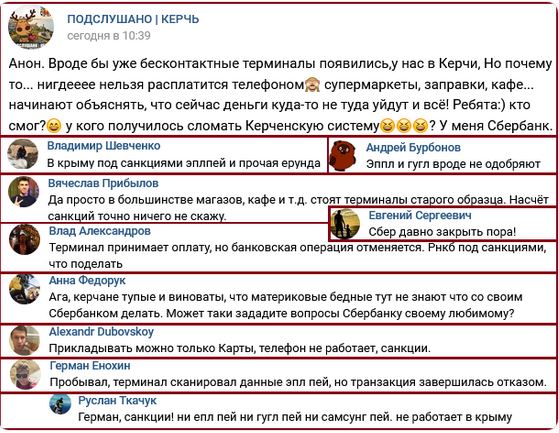 Легкие приступы радости от полезных санкций, которых никто не боится: “Анон. Вроде бы уже бесконтактные терминалы появились у нас в Керчи, но почему-то нигдееее нельзя расплатиться телефоном. Супермаркеты, заправки, кафе… начинают объяснять, что сейчас деньги куда-то не туда уйдут, и всё! Ребята, кто смог? У кого получилось сломать керченскую систему? У меня Сбербанк”. Ответы: “В Крыму под санкциями Эплпей и прочая ерунда”, “Эппл и Гугл вроде не одобряют”, “Да просто в большинстве магазов, кафе и т.д. стоят терминалы старого образца. Насчёт санкций точно ничего не скажу”, “Терминал принимает оплату, но банковская операция отменяется. РНКБ под санкциями, что поделать”, “Ага, керчане тупые и виноваты, что материковые бедные тут не знают, что со своим Сбербанком делать. Может, таки зададите вопросы Сбербанку своему любимому?”, “Прикладывать можно только карты. Телефон не работает — санкции”, “Сбер давно закрыть пора!”, “Пробовал, терминал сканировал данные Эплпей, но транзакция завершилась отказом”, “Санкции! Ни Эпл пей, ни Гугл пей, ни Самсунг пей не работают в Крыму”