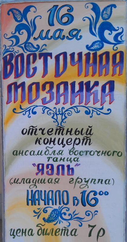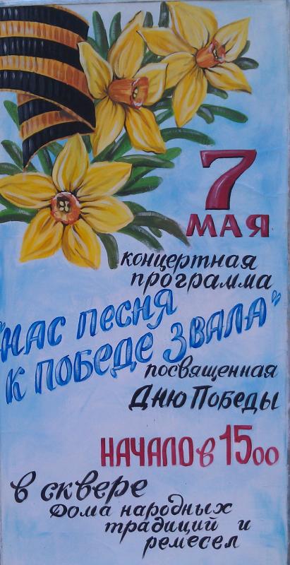 16 мая - Восточная сказка - отчетный концерт ансамбля восточного танца "Яэль". 7 мая - концертная программа "Нас песня к победе звала". |