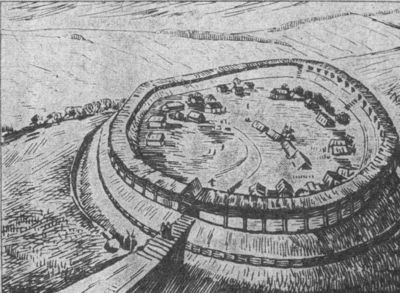 Древнегреческий ученый Птолемей (II в.) упоминает на среднем Днестре г. Клепидаву, расположенный в районе современного г. Могилева-Подольского4. Видимо, на территории Молдавии во II—IV вв. население снова достигло уровня развития, при котором начинают зарождаться ремесленно-торговые и административные центры. Однако на рубеже IV—V вв. поселения черняховцев были разорены гуннами. После этого начался новый этап в развитии ремесел и торговли, который привел к созданию городских центров лишь к X в. С этого времени на поселениях восточнославянской и балкано-дунайской культур широко развиваются ремесло и торгово-обменные связи. На среднем Днестре, где была распространена восточнославянская культура, возникло несколько крупных ремесленно-торговых поселений, являвшихся одновременно и административно-культурными центрами, о чем свидетельствуют укрепленные цитадели (городища)5. В ареале распространения балкано-дунайской культуры обнаружено только одно поселение с укреплениями. При раскопках поселений обеих культур были найдены материалы, иллюстрирующие значительное развитие железоделательного, кузнечного, ювелирного, гончарного и других ремесел. Так, на поселении у сел Екимоуцы и Алчедар в Резинском районе обнаружены мастерские ювелира и оружейника, а у с. Ганск в Котовском районе — кузнеца-железоделателя и гончаров.6. Рис. 44. Славянское городище X—XI вв. у с. Екимоуцы (Резинский р-н) |