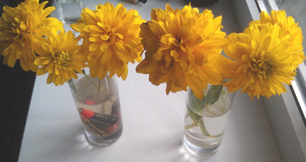 Еще один опыт с цветами и батарейками. Фото 1 - поставили батарейки в левый стакан. Фото 2 - спустя 2 дня цветы в стакане с батарейками завяли. |