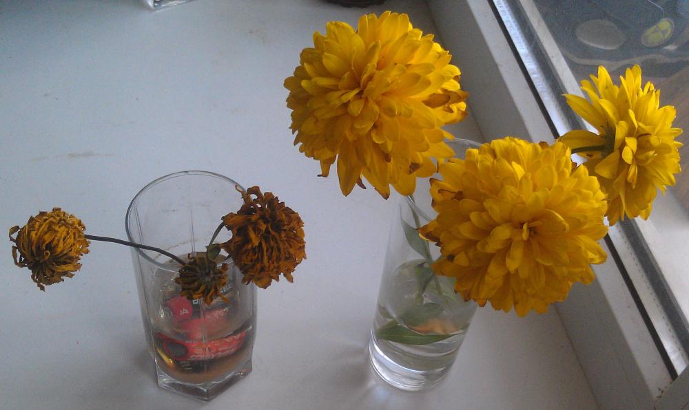 Добавил описание. В общем, цветок что справа - завял, в стакане были батарейки.