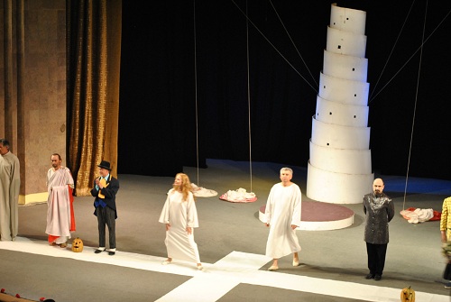 Хи-хи, каждый думает в меру своей распущенности. Ехала в маршрутке и краем уха слышала обсуждение спектакля бендерскими театралками, в т.ч. тетенькам жутко не понравился фаллический символ на сцене. Мне такая ассоциация и в голову не пришла, воспринимала это строение как вавилонско-пизанскую башню, что вполне соответствовало той языковой мешанине, которая сложилась во время спектакля.