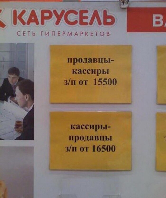 Prodavec-kasir menshe kasoj zanimayetsa cem kasir-prodavec ;) poetomu i zarplata mensha ;)
