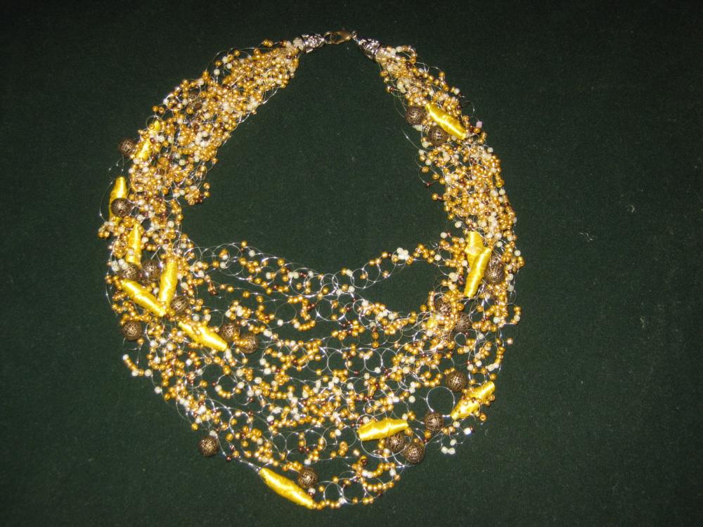 На шее смотрятся нежно,а когда совсем мало нитей бисер теряется, украшение кажется незаконченным, носит эффект дешевизны, кроме того в изделии есть металлические бусины и бусины из атласной ленты (тоже самодельные), и вот именно они смотрятся "одиноко" без бисерной массы.