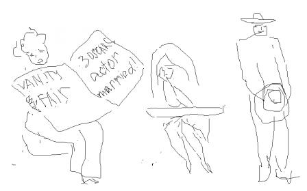 Третий рисунок - конец работы - см на часах, , офисные девушки смотрят и восхищаются афишей куда бы пойти, на беднягу - ноль внимания!)))