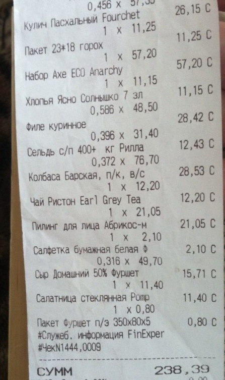 Побывала я в Фуршете раз эдак 5, Радуют цены на многие товары, но и качество их желает лучшего. Не буду вдаваться в подробности, но ассортимент меня не радует, хотелось больше разнообразия молочных продуктов, бытовой химии, кондитерских изделий. Понравилась очень рыбка копченая и живая, а также дешевые сыры. Но считаю, что выгоднее всего по прежнему - продукты покупать на центральном рынке. Вот один из чеков из Фуршета, остальные не знаю где.