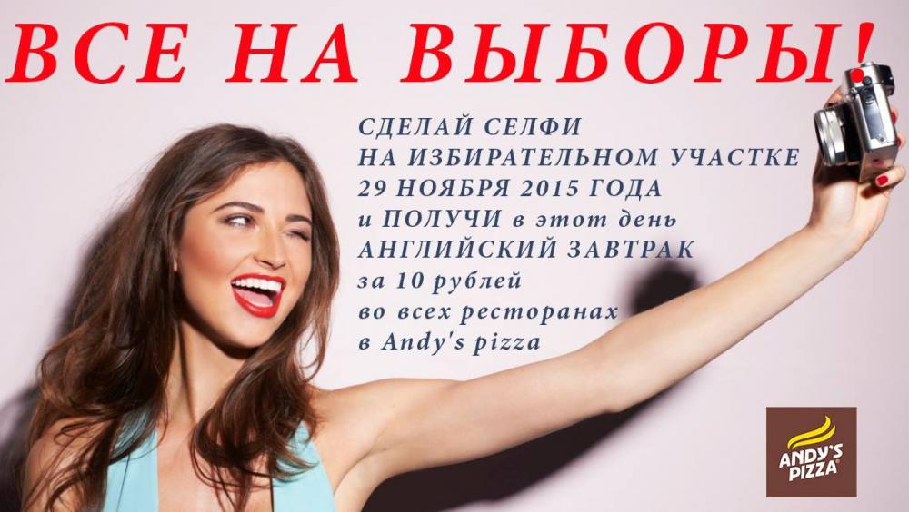 ВСЕ НА ВЫБОРЫ!!! Сделай селфи на избирательном участке 29 ноября 2015 года и получи в этот день Английский завтрак за 10 рублей во всех ресторанах Andy's pizza. * чтобы получить завтрак, необходимо: - сделать селфи на избирательном участке, чтобы было понятно, что вы именно там - прийти в ресторан, показать селфи официанту ** акция действует до 14.00, 29.11.2015 г. |